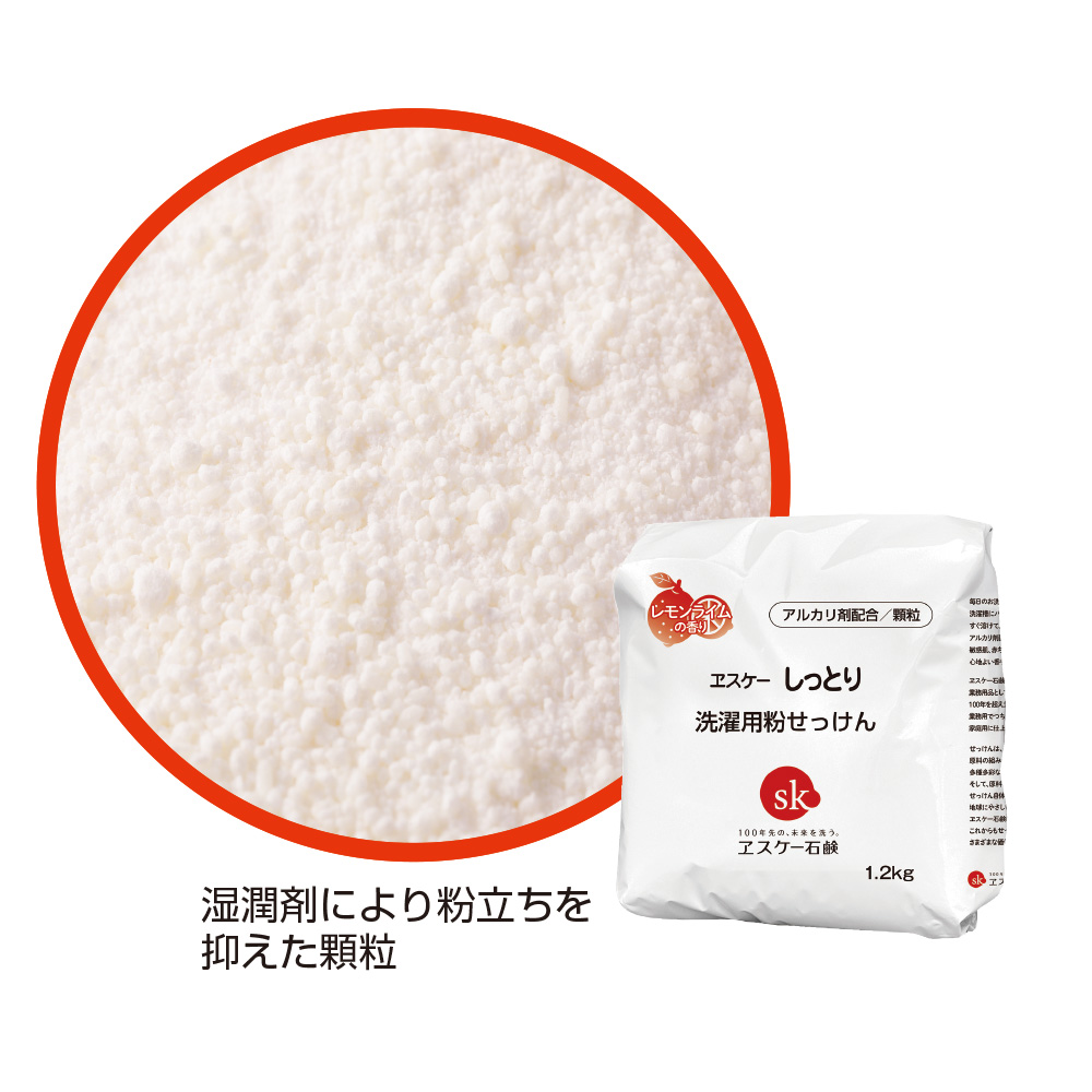 しっとり洗濯用粉せっけんは、造粒設備を用いた顆粒状。湿潤剤により粉立ちを抑えているので、使用時に粉飛びしにくくなっています。粒子サイズを小さくしているため、洗濯機で溶けやすいことも特徴です。