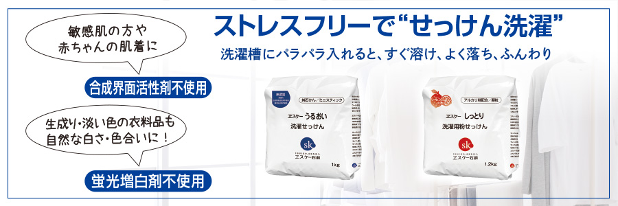 うるおい洗濯せっけんしっとり洗濯用粉せっけんは、業務用で培ったノウハウを活かした家庭用品です。ヱスケー石鹸の創業品目は粉せっけん。業務用品として多くのクリーニング店で100年を超え愛用されてきました。